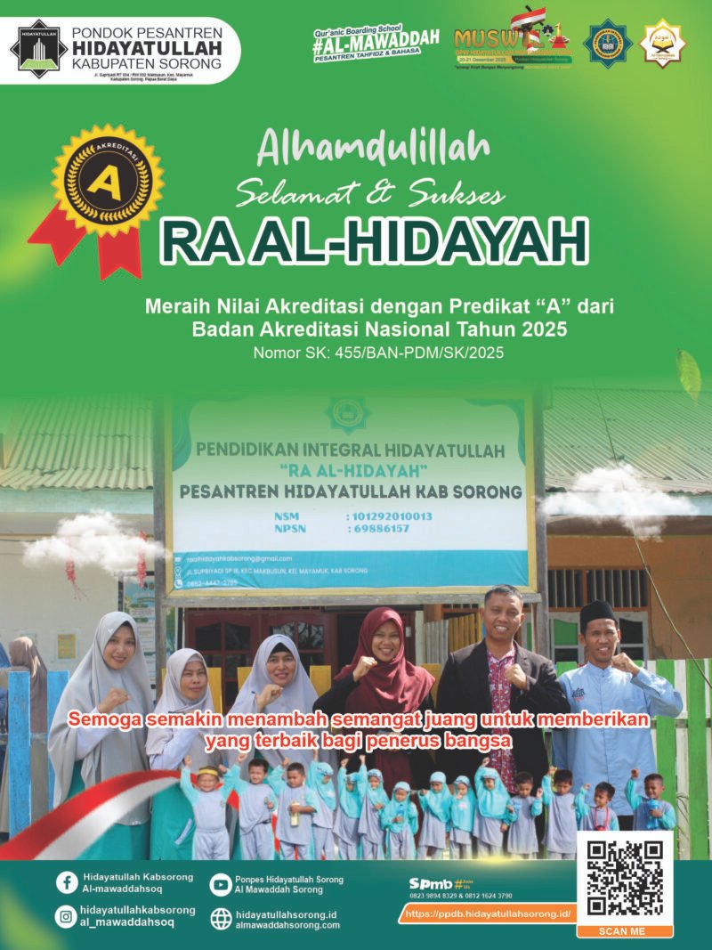 SORONG (hidayatullahsorong.id) — Lembaga pendidikan anak usia dini RA Al-Hidayah Kabupaten Sorong resmi meraih Akreditasi A. Keputusan tersebut tertuang pada SK Nomor 455/BAN-PDM/SK/2025 Tentang Penetapan Hasil Akreditasi Satuan Pendidikan Anak Usia Dini Tahap I Provinsi Papua Barat Tahun 2025.
